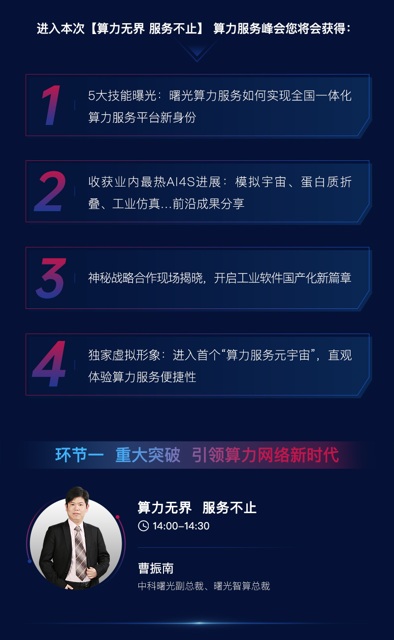 曙光智算作為中科曙光布局算力服務市場子公司,在成立一周年之際,誠邀產業專家、前沿用戶、行業伙伴齊聚一堂,參與我國首個聚焦算力服務市場與算力服務網絡的專題峰會。